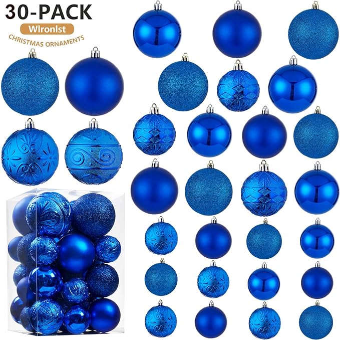 Wironlst Christmas Ball Ornaments - 30pcs Shatterproof Plastic Christmas Ornaments Hanging Ball Decorations for Xmas Tree, Holiday, Wedding, Party (Multi-Size, Blue)