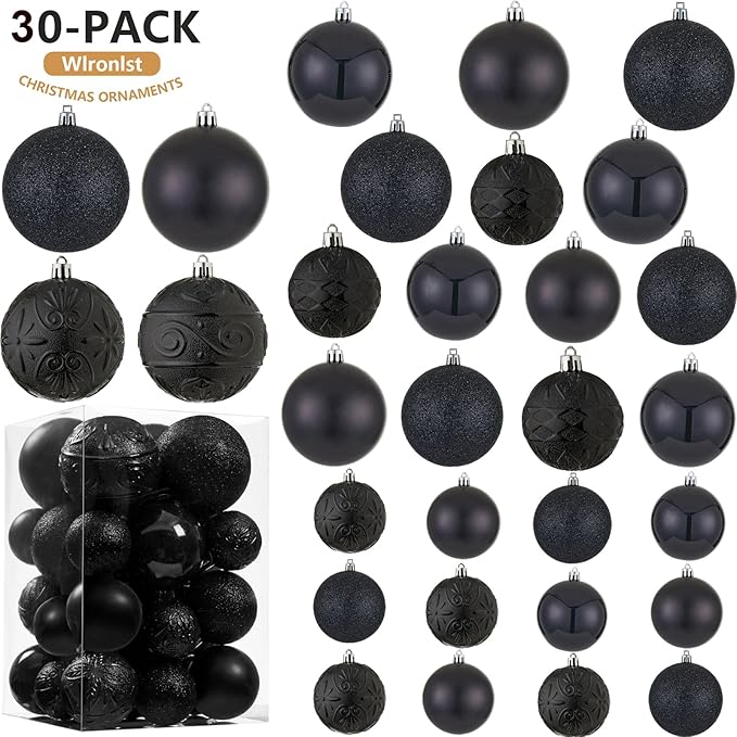 Wironlst Christmas Ball Ornaments - 30pcs Shatterproof Plastic Christmas Ornaments Hanging Ball Decorations for Xmas Tree, Holiday, Wedding, Party (Multi-Size, Black)