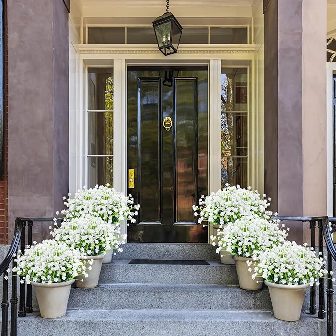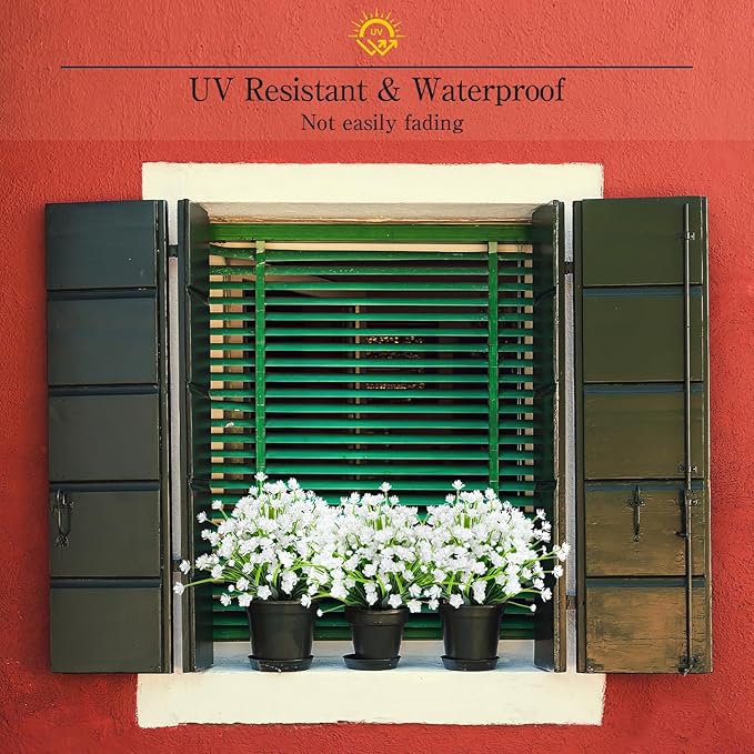 - Perfect for Outdoor/Indoor - Plastic flowers are ideal for outdoor porches,walkway,terraces windox box,front yard,pots,hanging planters,gardens,landscape,windowsills,allow you have beautiful color all year around.Also suit for birthdays,weddings,memorial place or grave,they can live anywhere and have withstood heavy rain storms and winds
