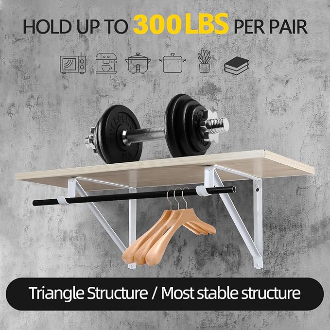 - Versatile shelf and rod support maximum load is 250 lbs per pair. Depth wall shelf and rod brackets are designed by triangular structure, provide good stability