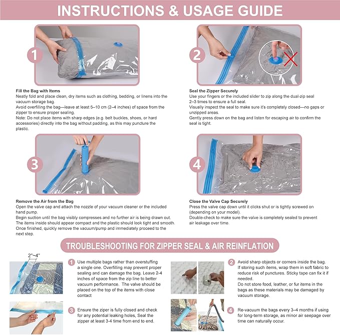 - Reliable protection: Made from extra thick plastic material, with the triple-seal turbo valve & double-zip seal design, our vacuum sealed bags get the air out in the suction process; Can be used repeatedly