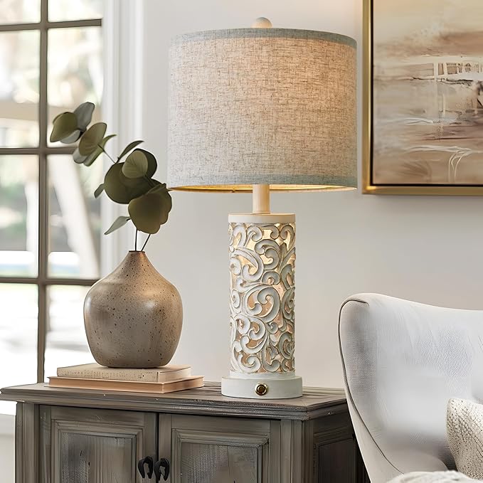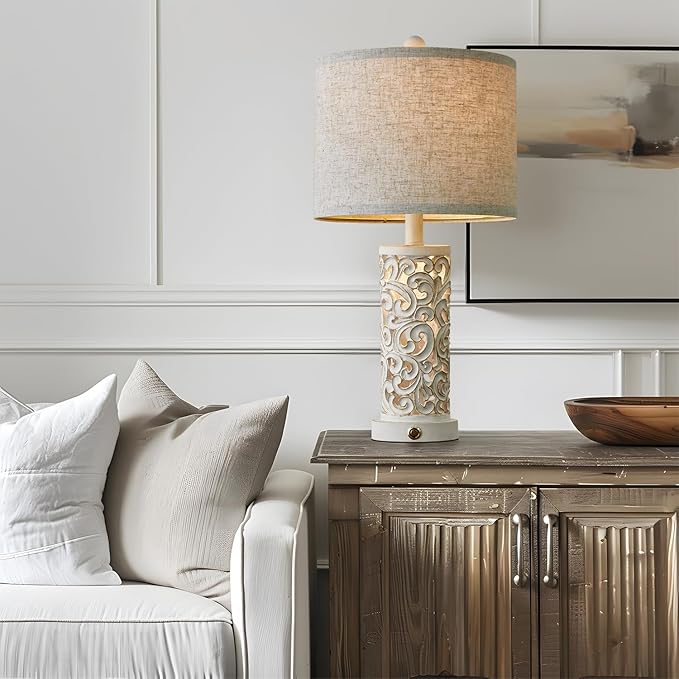 - Eye-Caring Farmhouse Table Lamps for Living room: The linen fabric lamp shade and the 3-way dimmable nightlight makes the glow softer so it can protect our eyes. Table lamp set is suitable for reading or working. I believe this pair of antique and unique table lamps will be the best choice for your family and friends!(Please note that the shade needs to be assembled)