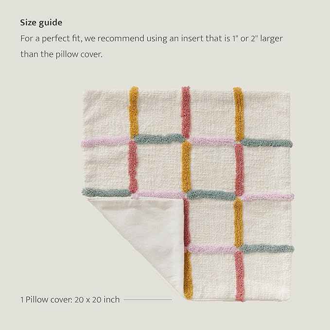 Double Stitch Checkered Throw Pillow Covers - 100% Cotton Tufted Boho Decorative Pillow Covers 20x20, Made in India, Square Plaid Cushion Case, Modern Home Decor for Couch, Sofa, Living Room, Multi