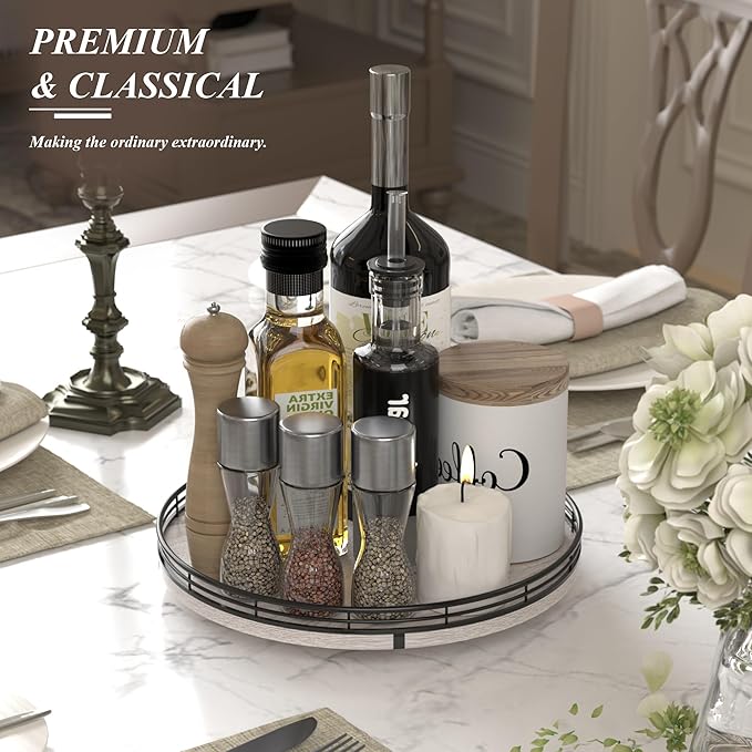 - πππΒ°ππππππππ :The base is made of solid wood, and the spinning mechanism is made of steel ball bearings, which are well-built and allow for 360Β°smooth spinning. This lazy Susan for table top is very attractive and very easy to use to keep your spices, condiments, and more organized and accessible.