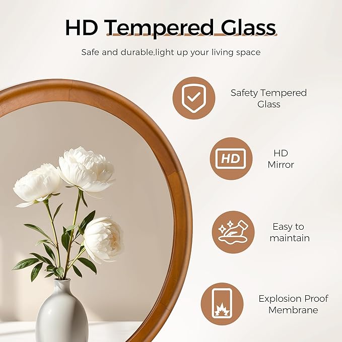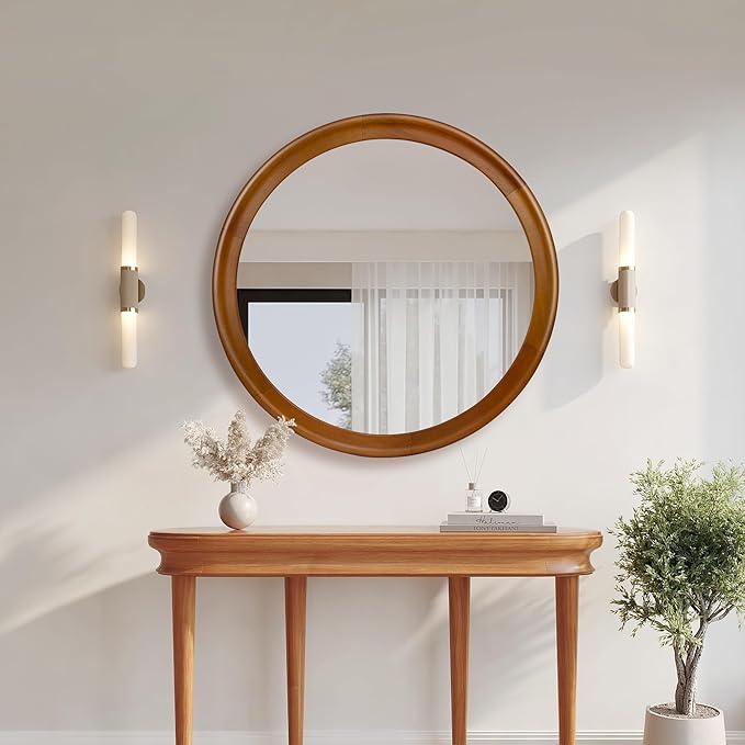 - [Great Design]This elegant 36 inch round mirror features a beautiful walnut wood frame with a circular design that creates a smooth transition from the mirror to the frame. The warm, natural tones of the wood add a touch of warmth and sophistication to any space.