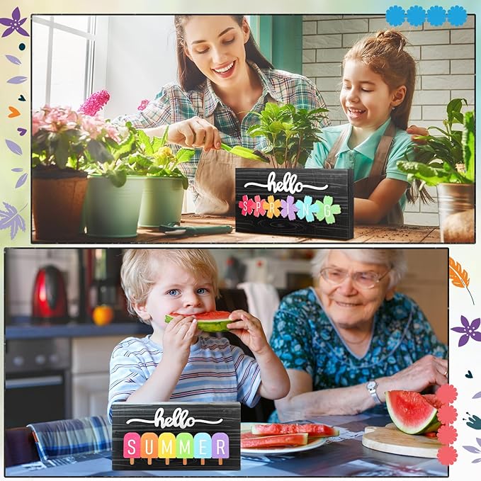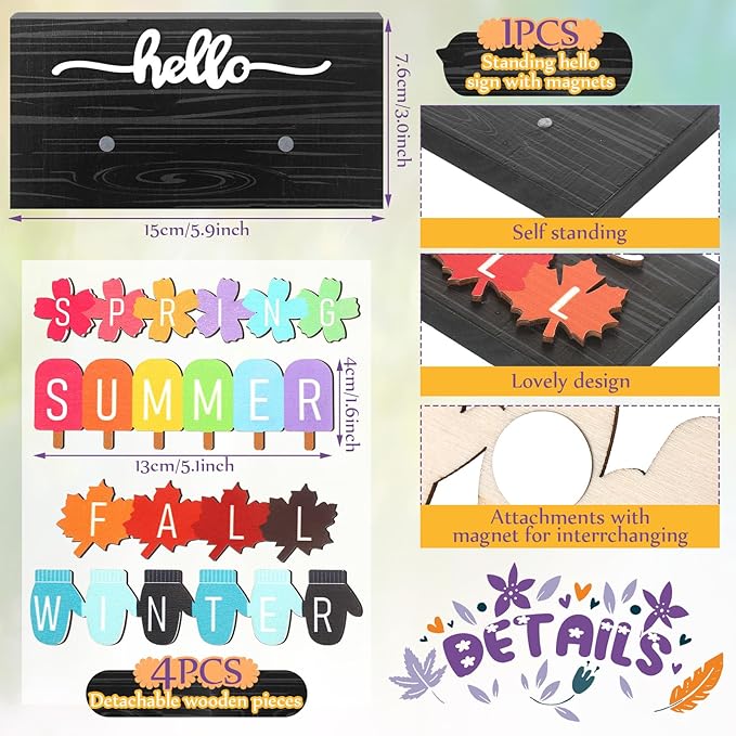 - Interchangeable Design: the hello spring summer fall winter wooden signs are designed to fit the seasons with bright colors, the [spring] is designed into the flowers, the [summer] is designed into the ice cream, the [fall] is designed into the maple leaves, and the [winter] is designed into the gloves, novelty and fun