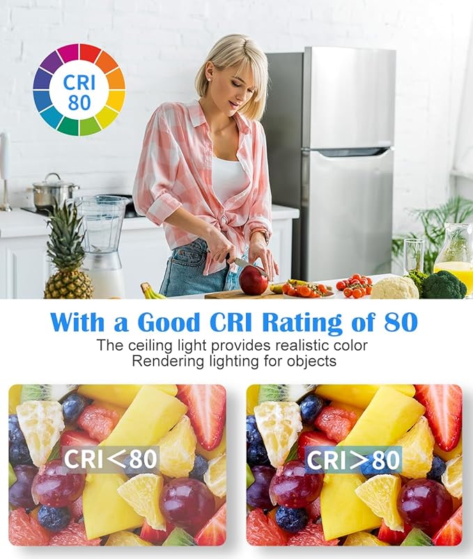 - Eye-Care and Premium Quality Lighting: Boasting a CRI (color rendering index) of 80, this ceiling light fixture enhances color accuracy, ensuring that objects and surroundings appear more vibrant and lifelike. Meanwhile, the flicker rate of the ceiling light is less than 30%, which can minimize eye strain and protect your eyesight.