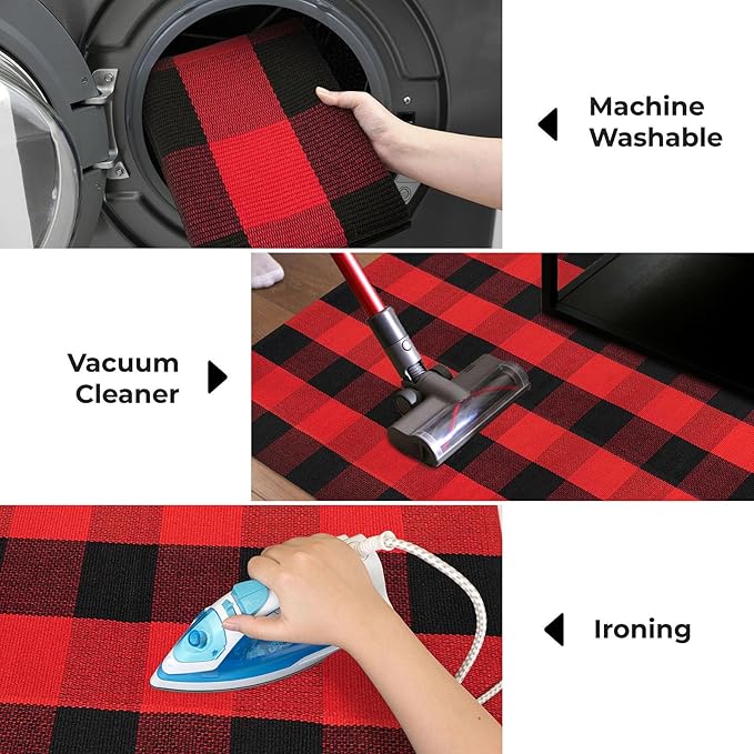- Machine Washable Rug: The red and black rug is machine washable for easy care. Vacuum, shake, or wipe to refresh, or machine wash on a delicate cycle for deep cleaning. Air dry recommended to preserve quality; no bleach, no dryer to extend rug life