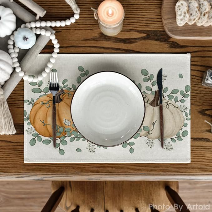 Artoid Mode Orange Pumpkins Eucalyptus Leaves Fall Placemats Set of 4, 12x18 Inch Autumn Thanksgiving Holiday Table Mats for Party Kitchen Dining Decor
