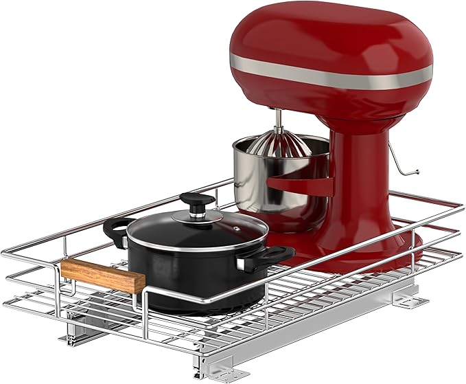 - 【Full Extension Sliding Out Basket】Made out of heavy-duty metal with full extension smooth sliding system with good fuction wood handle, you can make the most of cabinet space and easily access all your pots, pans, small kitchen appliances.