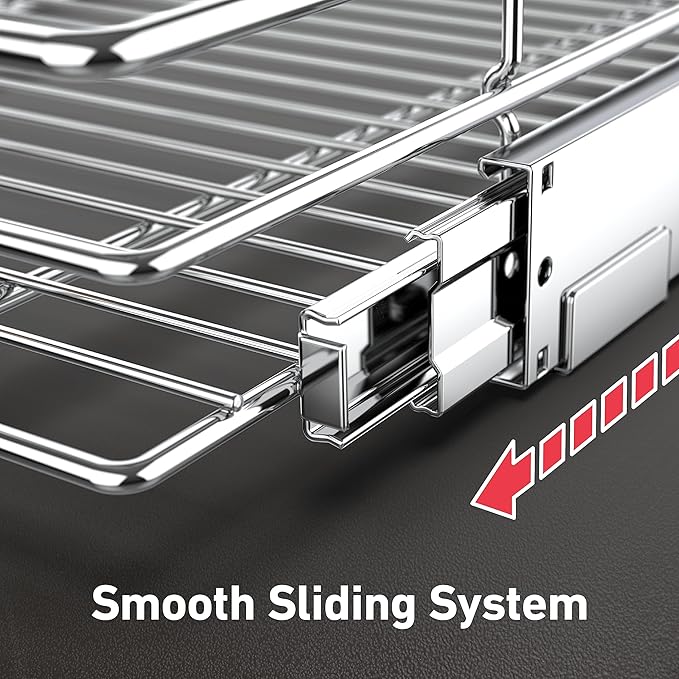 - 【Smooth Slide-Out System】This pull out cabinet organizer is manufactured with a ball-bearing system that slides out smoothly. Good quality chorme finish giving you professional quality for your home with unparalleled durability.