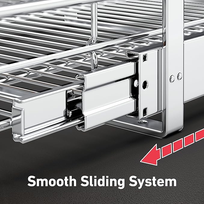 - 【Unique Design】Mount Walker 2 tier pull out cabinet organizer is double sliding, upward hook connecttion wire basket design make it easy assemble and more durable, full extension ball-bearing 3 section slide out slides let you easy access all the items. The 4 connecting rods are solid material, ball bearing glide system ensured a smooth and quiet sliding system every time. With full-extension slides that can support up to 100 lbs.