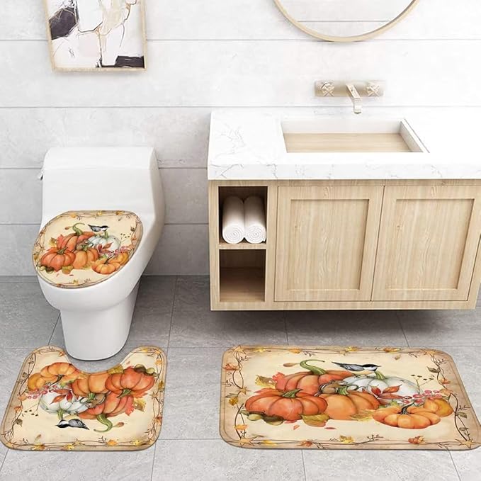 FZDHHY 4Pcs Pumpkin Shower Curtain Set Fall Bathroom Set Thanksgiving Bathroom Decor Set Autumn Shower Curtain Set with Rugs with 12 Hooks 72x72 inch