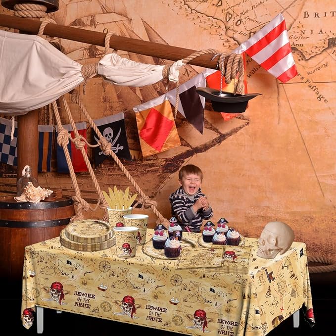 - Vintage Pirate Party Supplies: Serving 20 Guests -1pcs Map Pirate Table Cloth (70.8x42.5inch), 20pcs Dinner Plate (9inch), 20pcs Dessert Plate (7inch), 1pcs Happy Birthday Banner (5.51x7.08inch), 40pcs Beware of the Pirate Napkin (6.5x6.5inch), 20 pairs of knives and forks, 20pcs Cup (90oz) This vintage birthday party set is perfect for baby shower themed decorations and unforgettable moments with friends!