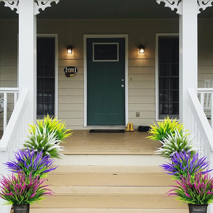 - 【UV Resistant Plants Outdoor】These Faux outdoor plants are made of high quality plastic, uv protection, weather proof. it's sturdy, attactive, and don‘t worry keep it live.“Plant” these fake tropical plant grassy on bedroom, bathroom, kitchen, balcony, window boxes, front porch, fence, patio, entrey way and yard. the uv resistant outdoor plants can hold up themselves nicely in the sun, rain or wind.