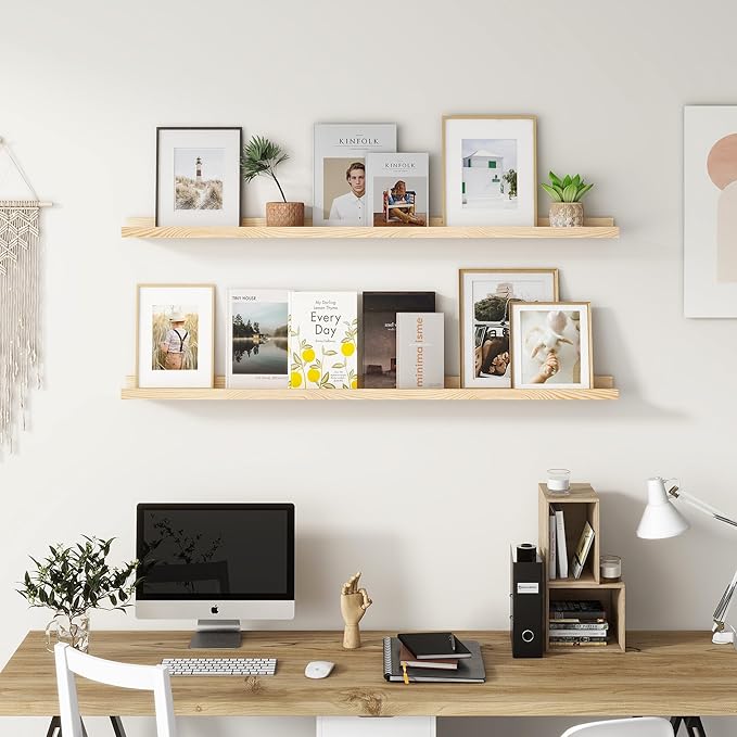 Picture Ledge Shelf for Wall, 36 inch Solid Pine Wood Nursery Book Shelves 2 Packs, Floating Ledge Shelves for Kids' Room Bedroom Bathroom Living Room Photo Frames Office Nursey Wall Decor, Natural