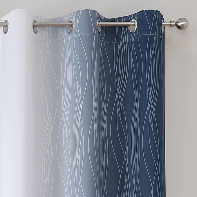 - OMBRE AND LINE DESIGN: The decorative blackout bedroom curtains are made of 100% high quality polyester fabric. The room darkening curtains feature two-color ombre design, offer you a modern style. Different from other ordinary ombre curtains, we added wavy line elements to make the curtains full of curvilinear rhythm beauty, create a luxury look and feel to your favorite space at home. Our grommet curtains offer 2 combinations, you can switch the position of the curtains for different look.