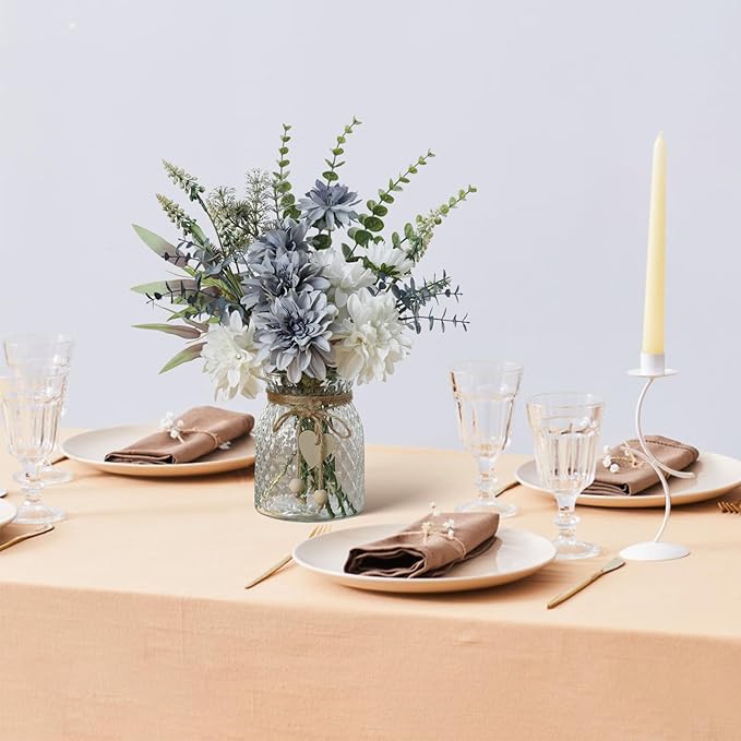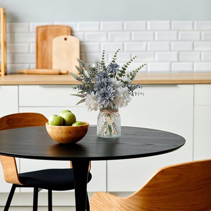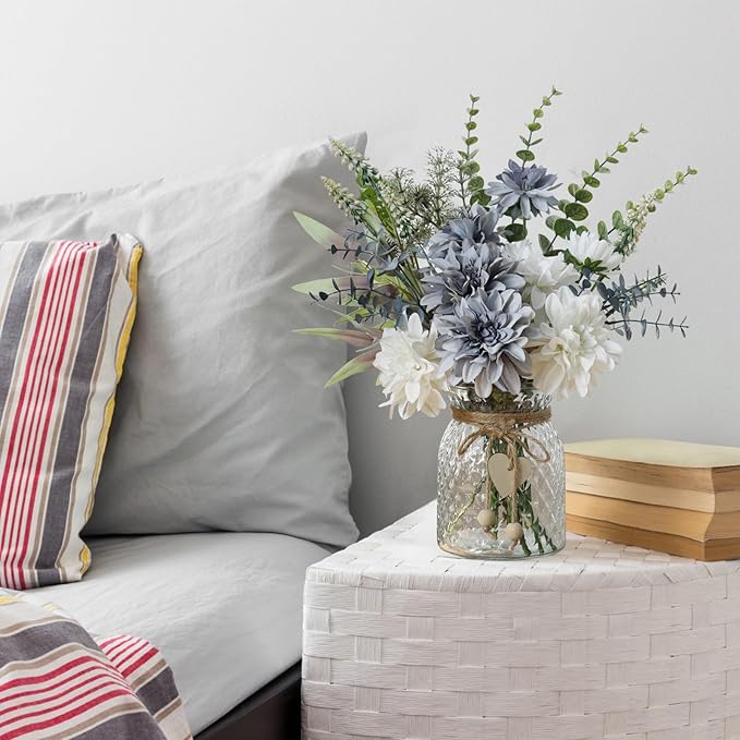 - LEFTOVER's Faux Flowers in Vase:Artificial Silk dahlia Bouquet in Vase include 8 dahlia heads(including 5 big and 3 small) eucalyptus stems and some decorative leaves, and a glass vase with a heart, ball pendant and twine,perfect for coffee table centerpiece and dining table centerpiece decor