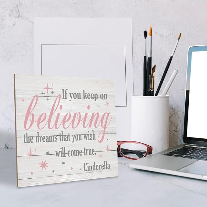 Nursery Decor, Inspirational Sign, Wood Plaque Table Art Sign 6.2*6.2inch, Princess Shelf Decor, Bedroom Decorate for Baby Girl, Cute Decorate, If You Keep On Believing The Dreams You Wish Will Come True