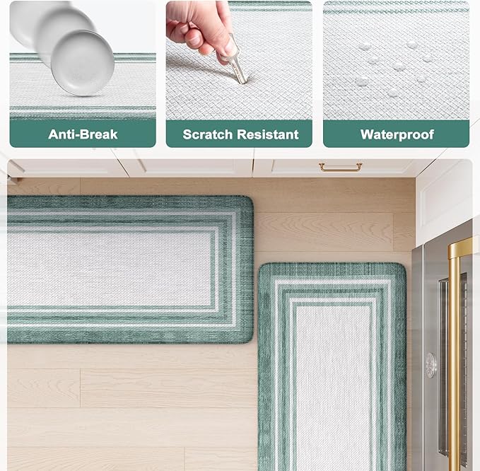 - Versatile: green and grey classic simple geometric pattern kitchen rug easily to match your kitchen decor,bright your home.Soft thick foam provides ample support for standing in kitchen sink,laundry room, office,bathroom,dinning room,or any other high-traffic area