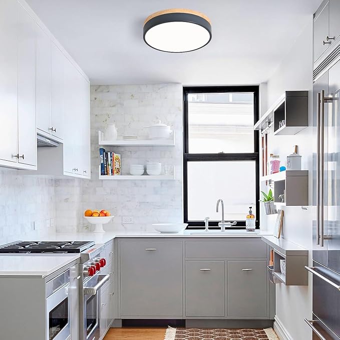 - Simple Design and Material: This 11.81 inch ceiling lamp made of hard metal and wood frame, acrylic light cover. The solid wood surface is glossy, uniform in color and clear texture. Acrylic lampshade with good light transmission performance, which can keep eyes from glare lighting. Inspired by Scandinavian design, simple but not oppressive