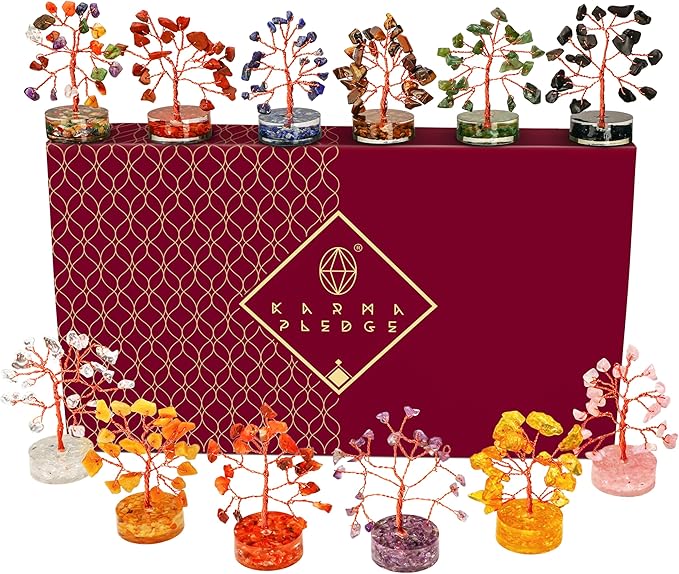 Crystal Tree Desk Decoration, Tree of Life 7 Chakra Healing Crystals & Stones for Positive Energy, Good Luck Gifts for Women and Mens, Set of 12 Handcrafted Trees for Home & Office (Orgone Base)