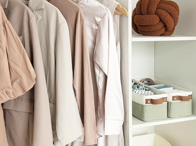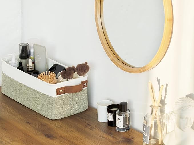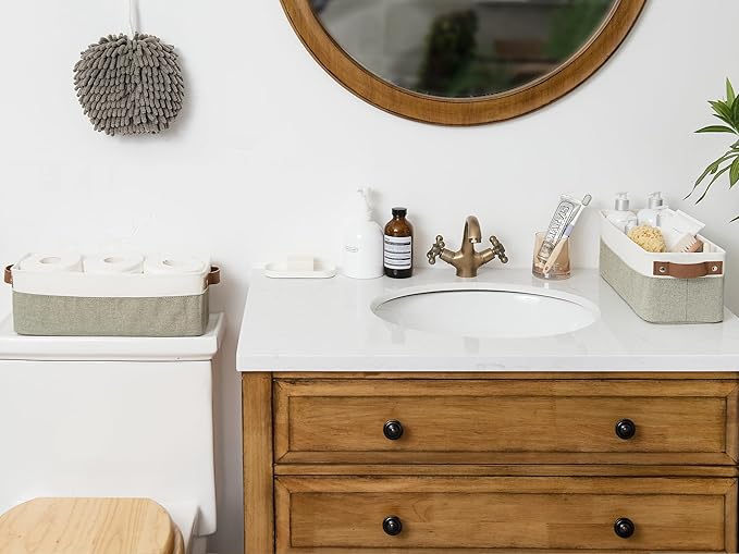 StorageWorks Narrow Storage Bins, Small Basket for Closet and Shelves, Fabric Organizer with Handles, Toilet Paper Storage, Green and White, 2-Pack