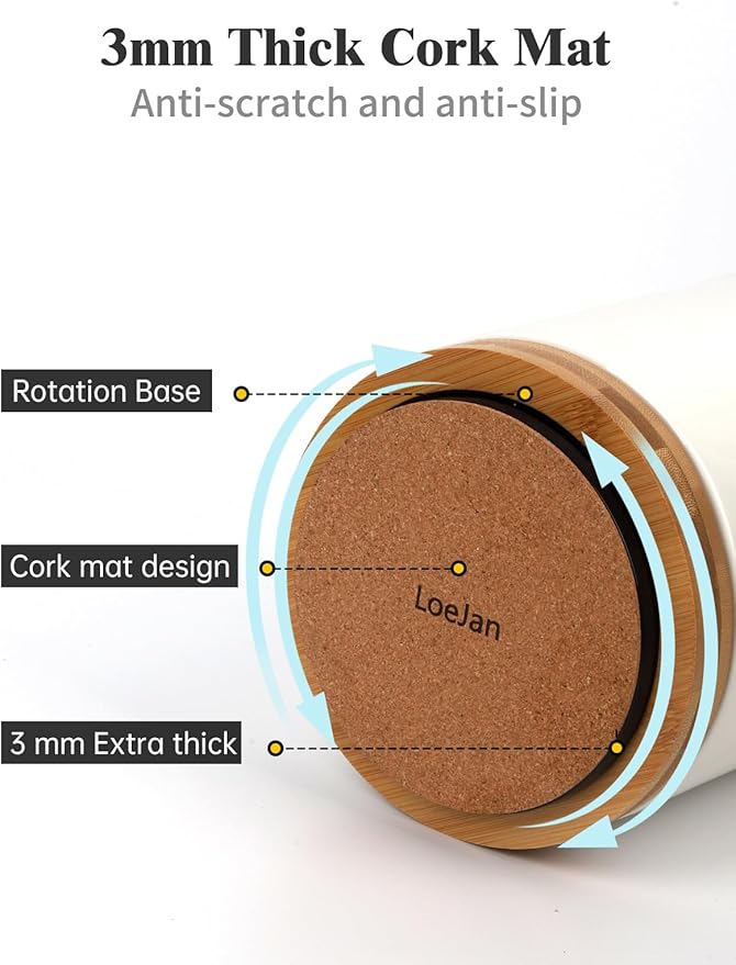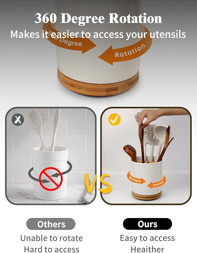 - ๐ฅ360ยฐ Smooth Rotating: The utensil holder has an exclusively made 360ยฐ rotating base that greatly increases the smoothness of l rotation. Allows you to reach the cutlery in your kitchen more easily. With just a flick of the fingertip it rotates h several revolutions easily and smoothly