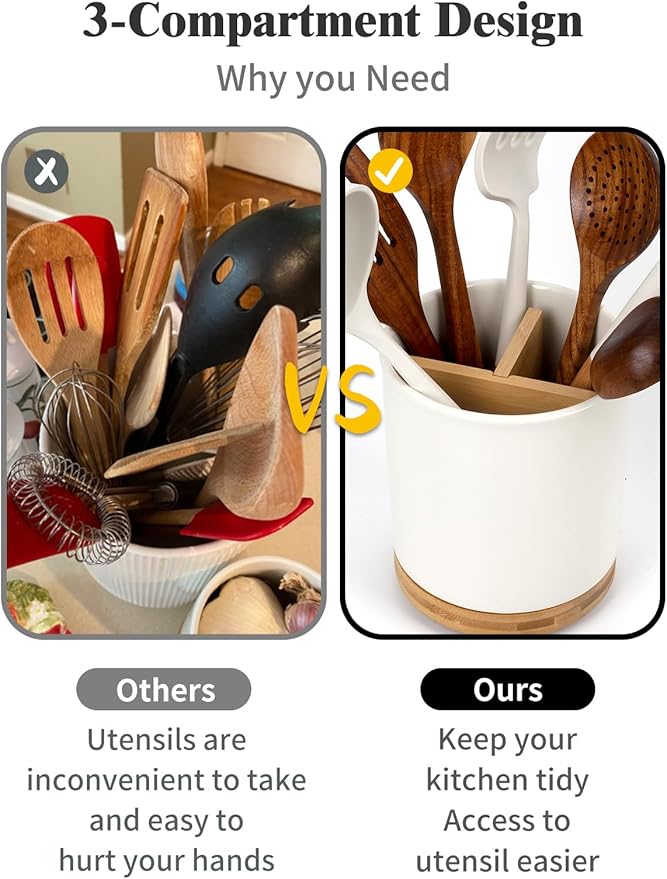 - ๐ณ3 Compartment Design: It allows you to sort your utensils according to your needs, which keeps them neat and tidy while gripping them more quickly. The dividers are removable and therefore easy to clean.