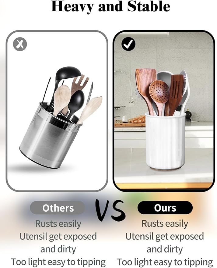 - 🥘Thoughtfully Sized for Daily Use: At 6.7″H x 5.4″W, this compact crock holds 10–15 essential utensils and can accommodate all the frequently used utensils on the counter. A convenient solution for overflowing kitchen drawers and countertop clutter.