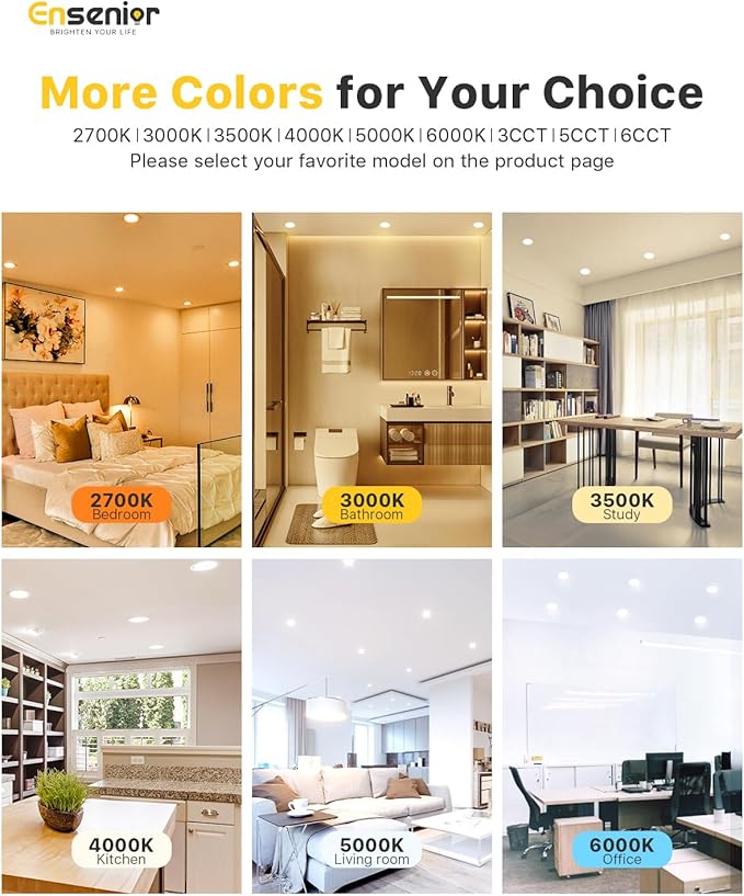 - 5CCT in ONE - Choose from 2700K, 3000K, 3500K, 4000K, 5000K with a simple click on the side of the J-box, Ensenior's canless recessed light 4 inch provides perfect lighting for your bedroom, living room, kitchen, bathroom, home office and other rooms.