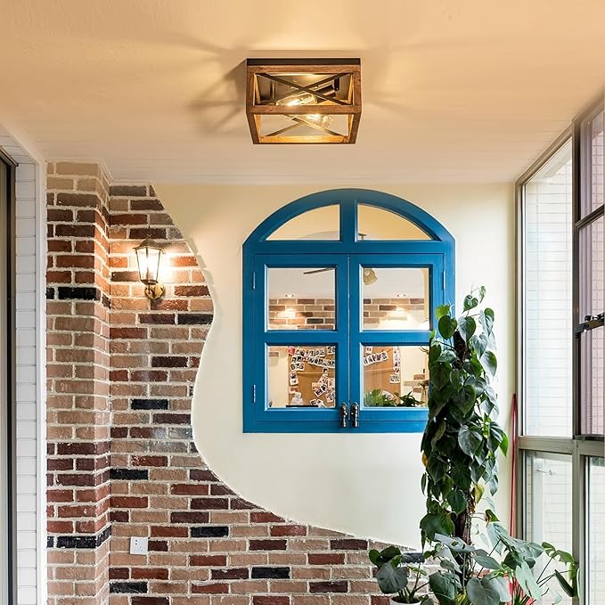 - 【Rustic Farmhouse design】The ceiling light is a good combination of wood and metal, features X frames structure and wood decoration provides retro style and unique looking for updating your home. Flush mount ceiling light features piano paint process, beautiful and durable.