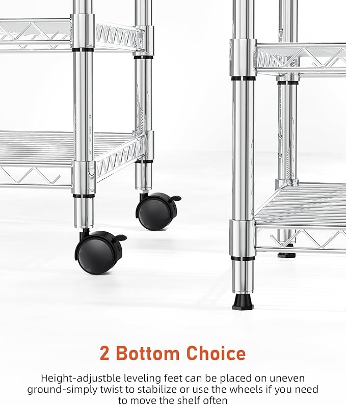 - Adjustable Design with Wheels - Features durable steel construction with adjustable leveling feet and four wheels for mobility. Shelves adjust in 1-inch increments for customizable storage