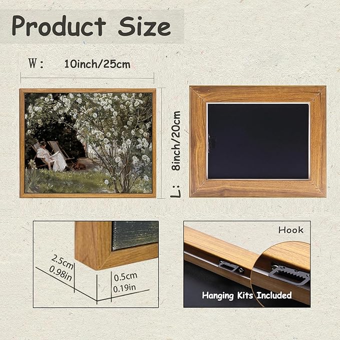- 【Ready To Hang】Measuring 8x10Inch(20x25cm), this framed canvas art wall decor arrives ready to hang on the wall with hanging kits. (Before nailing the hook onto your wall, please refer to the installation instruction image provided. ) This vintage neutral bedroom wall art print will bring a soothing effect to any room of your home with its calming colors. This French country roses garden wall art is perfect for farmhouse style spaces, with a bold elegance that makes it an iconic centerpiece for you.