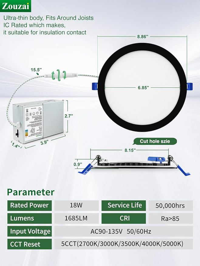 - ๐ใSuper ThinใใFlicker-free & No noiseใใHigh Brightness & High CRIใ The 8 inch led recessed light use the world's leading LED chips with higher lumens and lower power. 1685LM consumes 18 Watts, which equals to 150W halogen lamp, saving you up to 95% in energy costs.