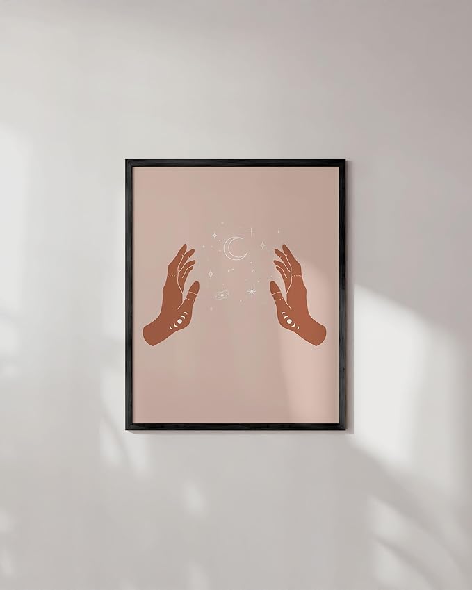 - ADD A DOSE OF MAGIC TO YOUR SPACE: This Haus and Hues spiritual wall art is a celestial masterpiece that will bring a peaceful and magical ambiance to any setting. Taking inspiration from extra-stellar elements, this celestial wall decor shows the glimmering constellations and crescent moon between two celestial hands. This astrology print uses a terracotta palette that blends well into any mid-century modern, or minimal decor and can be hung in your bedroom or displayed as an art gallery