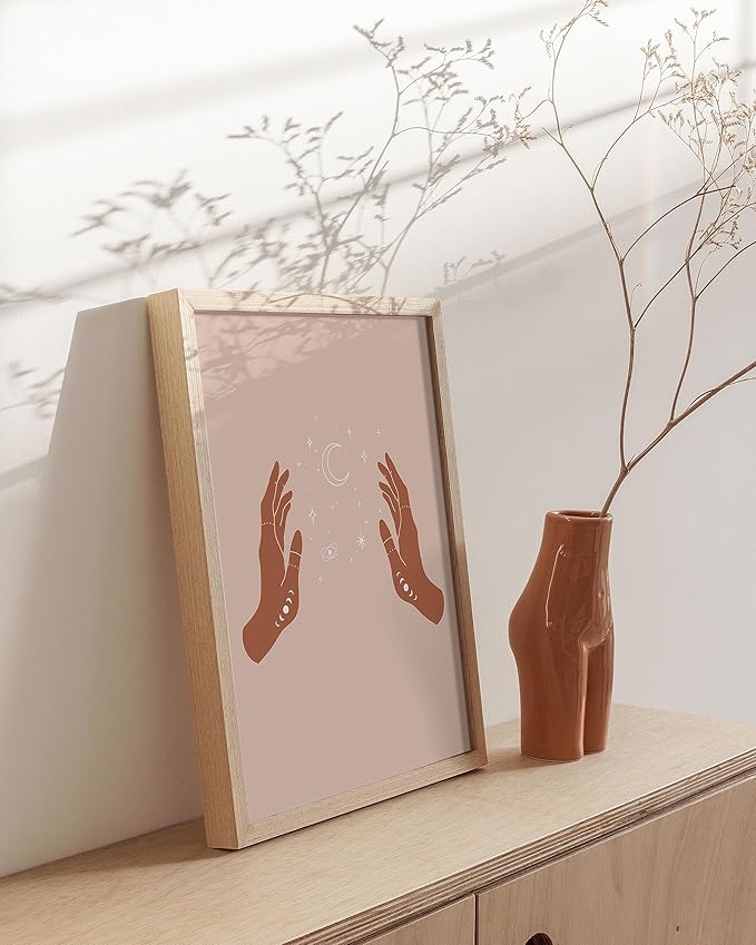 - PREMIUM QUALITY: We use a giclée printing technique on 8.5pt coated poster paper. The paper we use for spiritual room decor and boho wall art is sourced in the US, and our inks are water-based and toxic-free. Our Pennsylvania oak frame adds the finishing touch to the boho wall art. It’s equipped with plexiglass covered by protective film and two metal hangers for horizontal or vertical hanging. Boho prints wall art is in a durable box for protection while in transit
