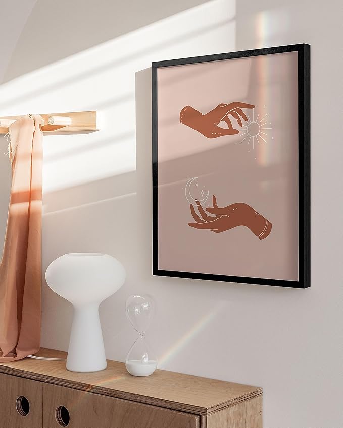 - AN EARTHY CELESTIAL TOUCH: Follow the dreams of the past with this sun and moon wall art that shows off an artful mix of warm tones and pops of vivid color. This spiritual room decor features two celestial hands plucking the warm sun and glittering moon right from the sky. The earthy tone of the background adds a retro feel and a neutral pop of color to your walls. Eye-catching and unique, this moon and sun art print creates an artistic accent while adding a mystical feel into any room