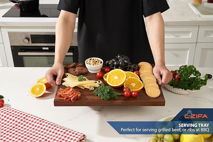- [SAFE CUTTING BOARD]: This wooden cutting board for the kitchen is made from the walnut wood, finished safely. Solid wood has a beautiful wood grain, high economic value, excellent durability. To enhance its quality, this nice dark cutting board is finished safely with linseed oil, beeswax, and carnauba wax, resulting in a smooth and durable surface.