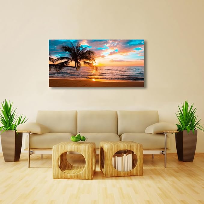 - 1. Bring the beauty of the beach and sunset indoors with our stunning wall art, featuring a captivating seascape with palm trees.
