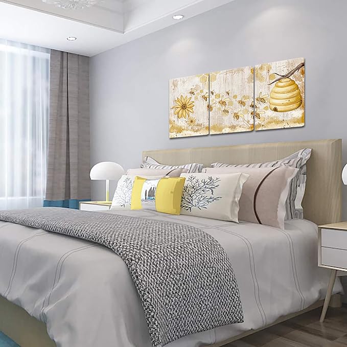 FuShvre Vintage Yellow Wall Art Honey Bee Canvas Painting Prints Kitchen Decor Bee and Flower Daisy Pictures for Famrhouse Wall Framed 16"x24" Each (Medium, White)
