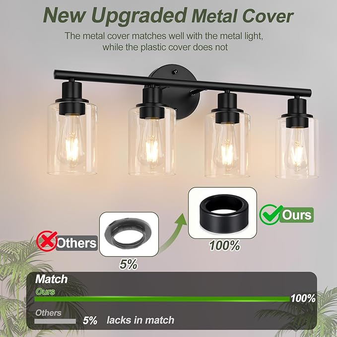 - 【Upgraded Matte Black Finish】The vanity lighting fixtures feature a sleek matte black finish lamp body accompanied by clear glass shades. The upgraded finish not only adds an elegant touch but also includes a scratch and tarnish-resistant coating, ensuring that the black bathroom light maintains its pristine appearance over time. This exquisite bathroom vanity light is suitable for various decoration styles, making it the perfect choice to enhance your home lighting.