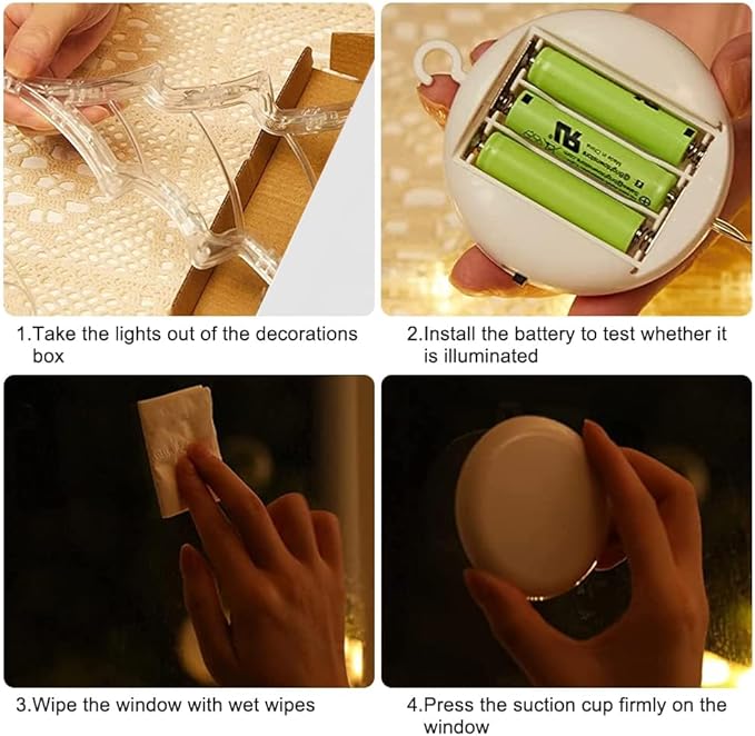 - 🌟【Usage Guide】These Christmas window lights can be easily attached to any smooth surface such as ceramics, windows, mirrors, glass, metal, etc. Please make sure the suction cup is clean before installation and add appropriate water to increase adhesion. If you want to use them on rough surfaces you can use some tape.