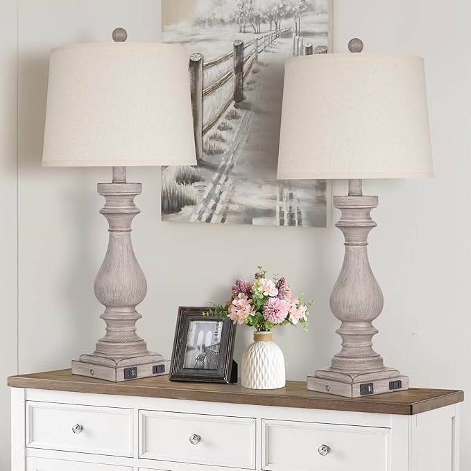 - 【Farmhouse Rustic Retro Table Lamp】- Resin bedroom lamps matches perfectly with Cylindrical oatmeal lampshade to create an elegant atmosphere,easy to fit in most decor for modern,classic,rustic,industrial,retro,nordic.Each lamp is 29'' high, 12.5'' long and 12.5'' wide, perfect for living room,bedroom,foyer,hallway,dining room,office,study and any room you like