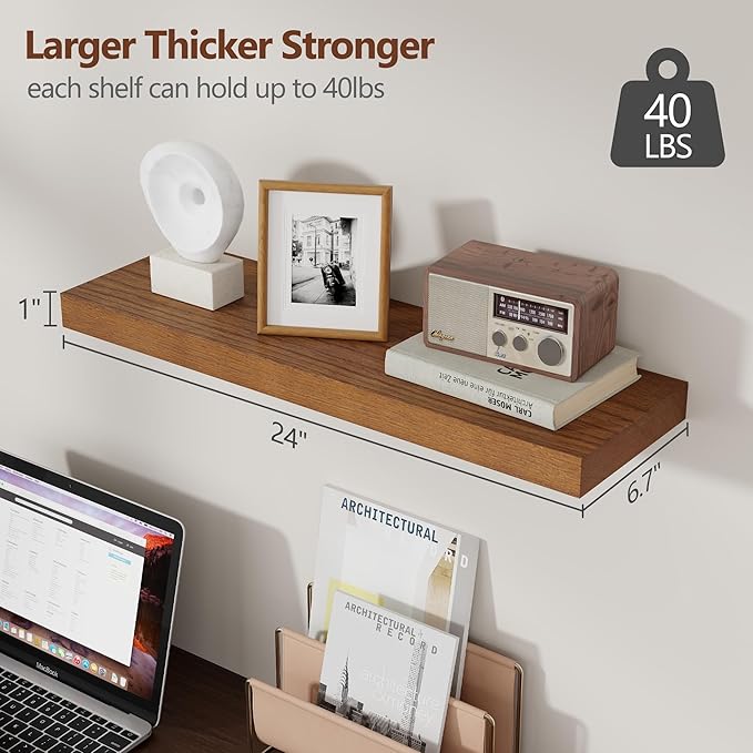 - MAXIMIZE WALL SPACE - Look at our wood shelves if you're still worried about insufficient floor space! The floating wood shelves measure 24W x 6.7D x 1H. Just the right size effectively utilizes wall space, reduces clutter in the room, and keeps the space neat and clean