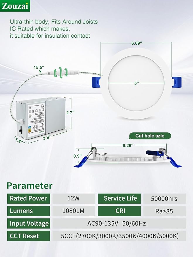 - ✅【Super Thin.Flicker-free & No noise】zouzai light has a lifespan of up to 50,000 hours, offering durability and energy efficiency. It is certified by ETL, Energy Star, FCC, and equipped with UL-approved quick-connect terminals for safe wiring. The fixture is IC-rated, making it safe for direct contact with insulation. With a damp-rated design, it is suitable for indoor use and covered outdoor areas (such as under eaves), but not for direct water exposure. The housing is made of corrosion-resistant aluminum, ensuring long-lasting strength and reliability.