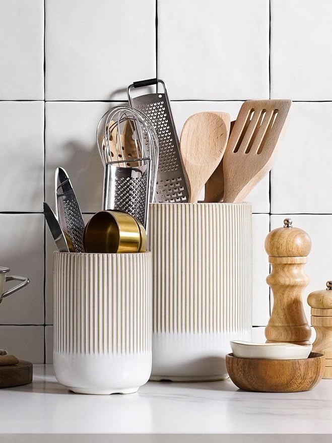 - Farmhouse Home Decor: Our kitchen utensil organizer features a boho, rustic finish highlighted by vertical ribbed and fluted stripes; This stylish design seamlessly complements any kitchen decor, elevating both your culinary efficiency and the overall ambiance of your home