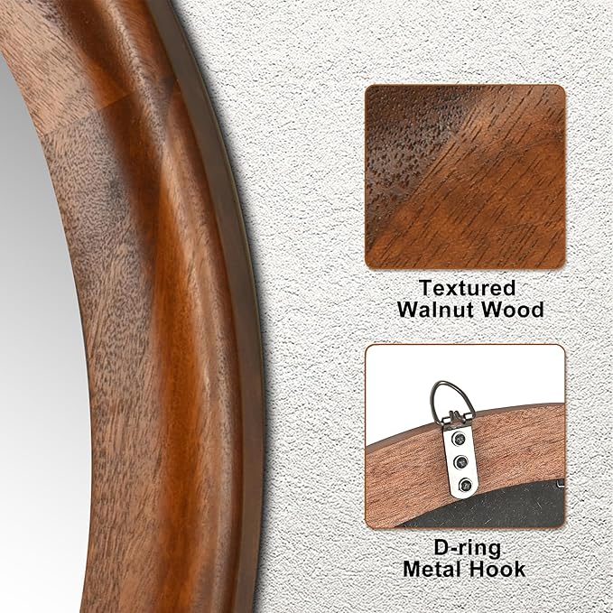 - [Great Design]This elegant 24 inch round mirror features a beautiful walnut wood frame with a circular design that creates a smooth transition from the mirror to the frame. The warm, natural tones of the wood add a touch of warmth and sophistication to any space.