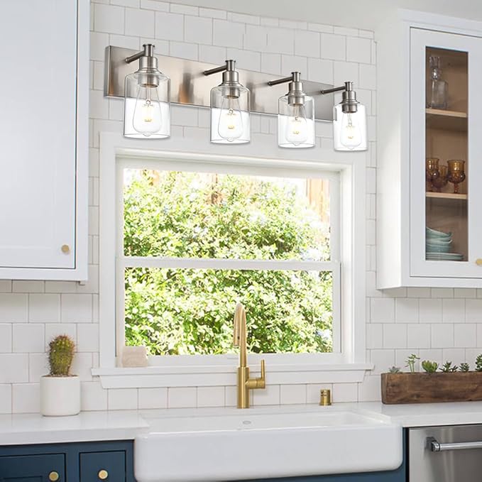 Bathroom Vanity Light Fixtures, 4-Lights Modern Brushed Nickel Wall Mounted Lamp with Clear Glass Shade for Bedroom Over Mirror