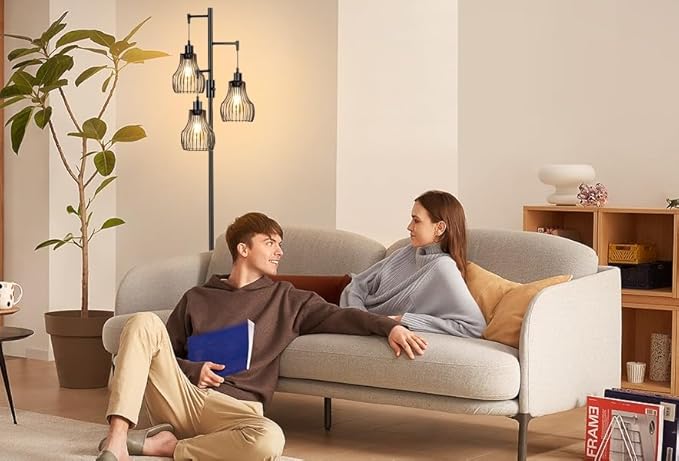 Dimmable Floor Lamp, 3 x 800LM LED Edison Bulbs Included, Farmhouse Industrial Floor Lamp Standing Tree Lamp with Elegant Cage Tall Lamps for Living Room Bedroom Office - Black